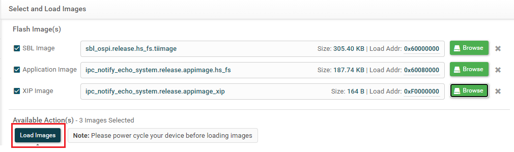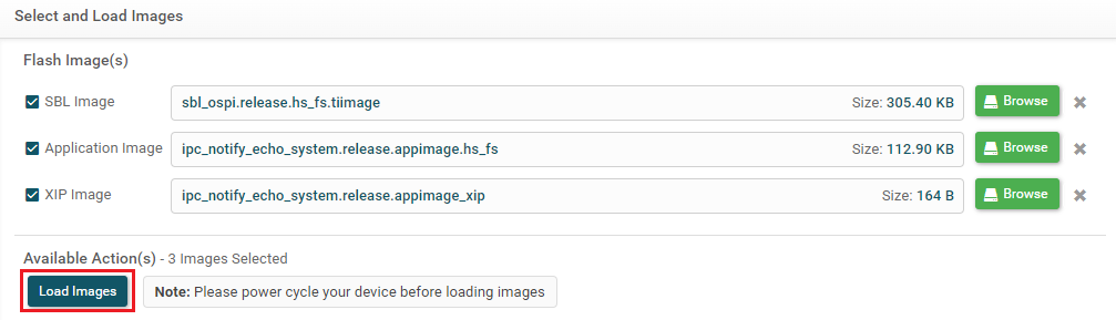 • Click the "Browse" button to select the program you want to flash. Serial Uniflash session supports three binary image formats - SBL, application image, XIP application image. It is not necessary to have three images in order to carry out the operation.