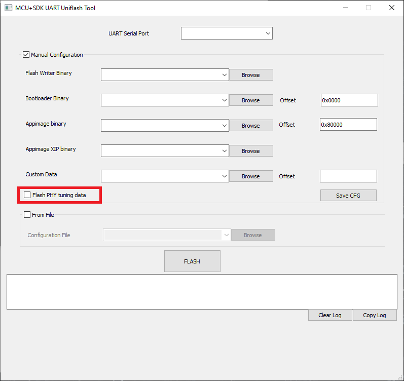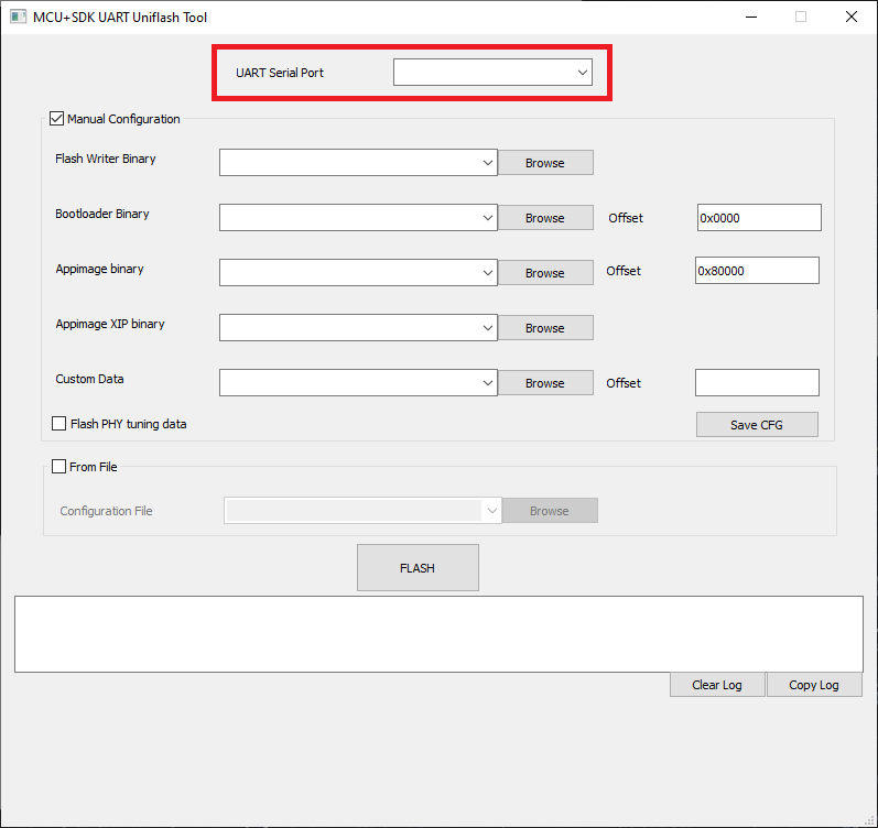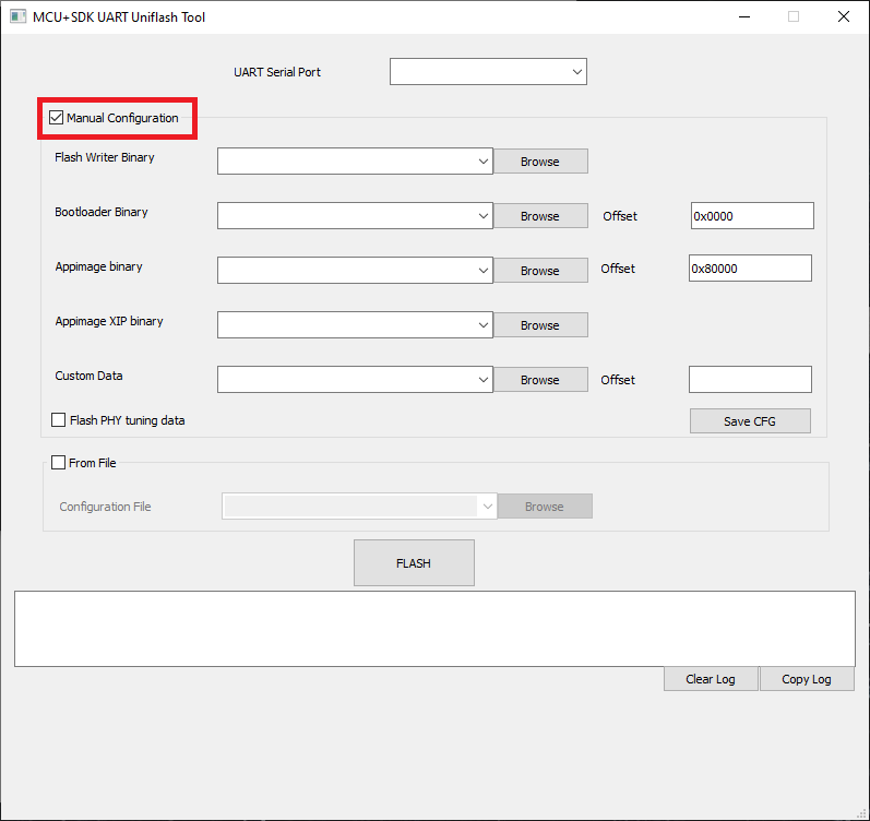 • From File : Flash using a configuration file (*.cfg extension) specifying what needs to be flashed. This is a convenient option if the files to be flashed are pretty much the same for every try. In fact even in the manual config case, a cfg file is created internally and used for flashing. This cfg follows the same format used by the CLI script.