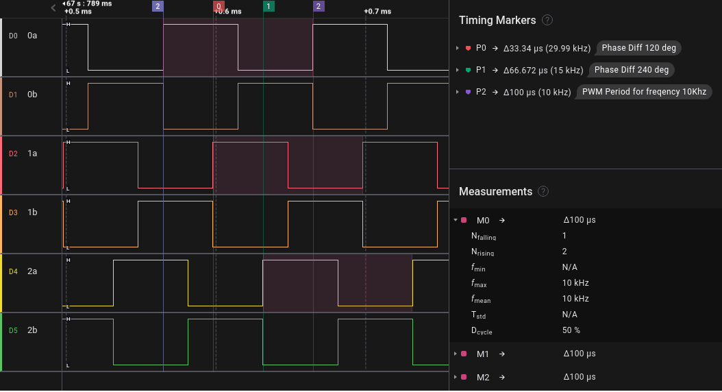 Signal of 10kHz with duty of 0.5 is configured on ePWMxA & ePWMxB with ePWMxB inverted. Also, phase of 120 degree is configured between EPWM0 to EPWM2 (EPWM2 to EPWM4 in case of AM261x-LP) signals.