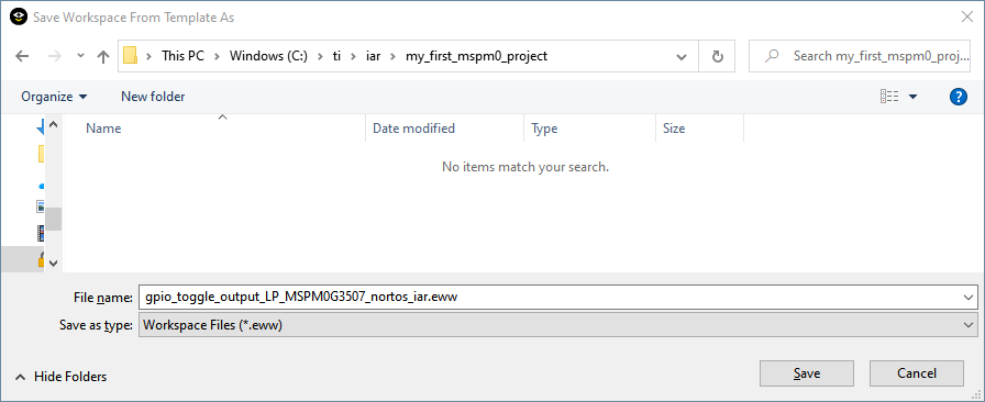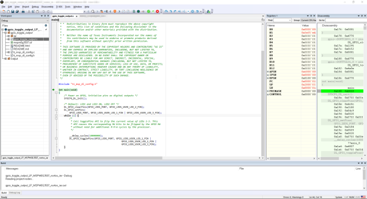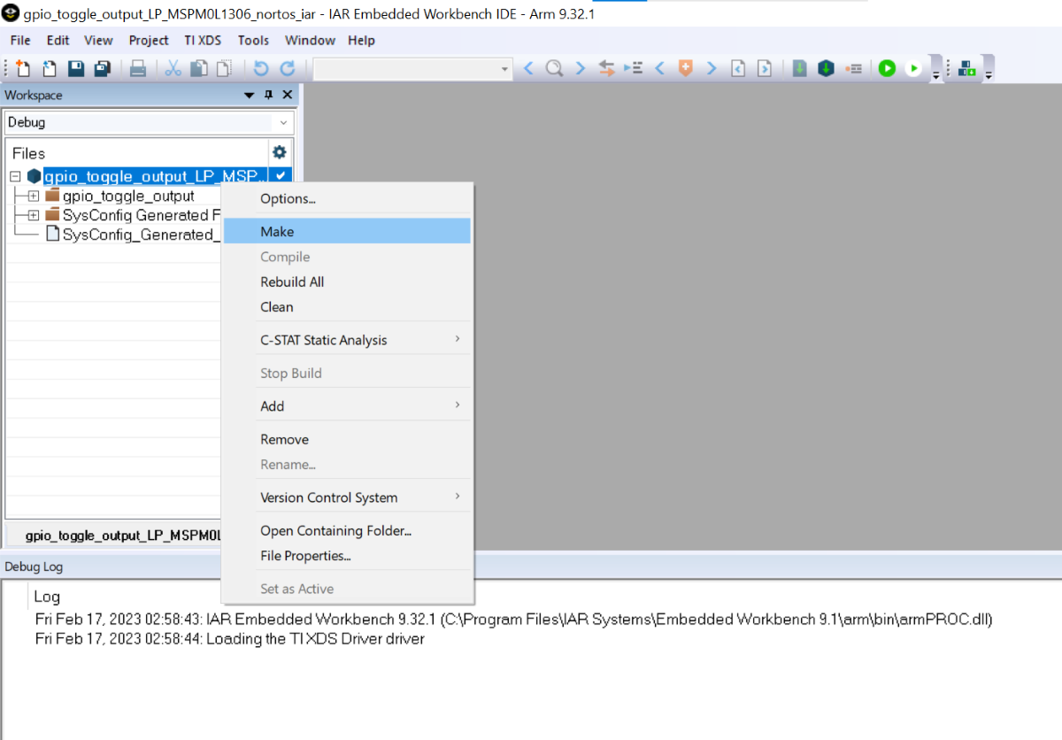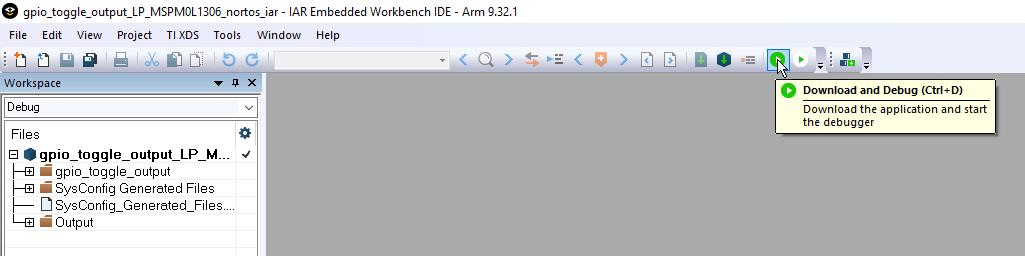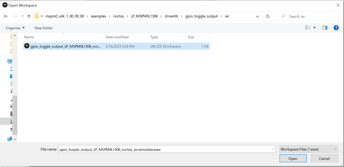 <MSPM0_SDK_INSTALL_DIR>/examples/and open the .eww workspace file. For example<MSPM0_SDK_INSTALL_DIR>/examples/nortos/LP_MSPM0L1306/driverlib/gpio_toggle_output/iar/gpio_toggle_output_LP_MSPM0L1306_nortos_iar.template.eww.