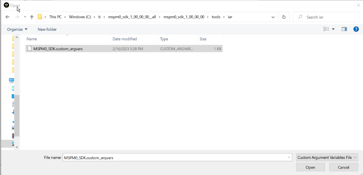 <MSPM0_SDK_INSTALL_DIR>/tools/iar/and open MSPM0_SDK.custom_argvars.