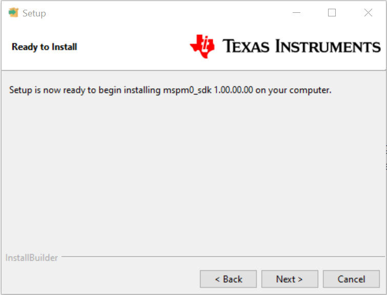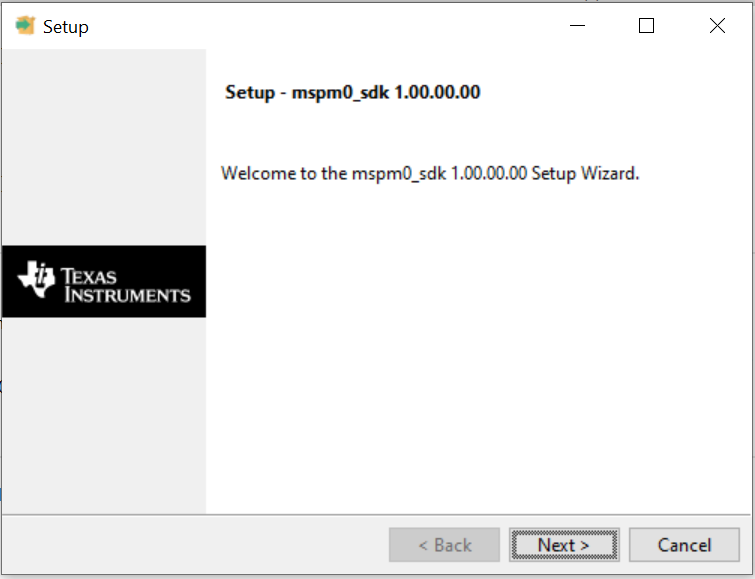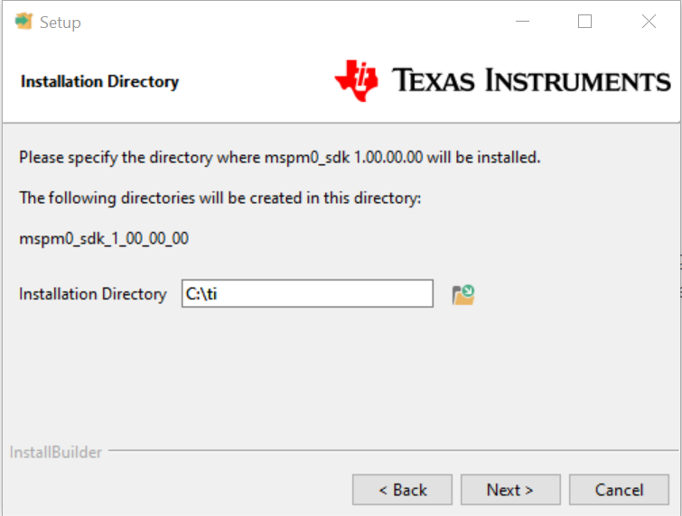 c:\tiwhich will install the SDK atC:\ti\mspm0_sdk_<version>\. This path will be referred to as<MSPM0_SDK_INSTALL_DIR>in sections below.