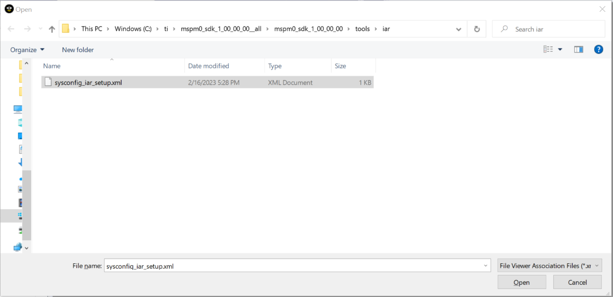 <MSPM0_SDK_INSTALL_DIR>/tools/iar/and open sysconfig_iar_setup.xml.