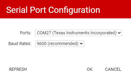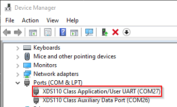 The correct COM Port can be determined by opening your Device Manager, looking under Ports, and seeing which port is XDS110 Class Application/User UART.