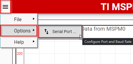 Configure the GUI settings to select the correct COM port and Baud Rate. Modify these settings by clicking on the menu icon in the top left corner, and then selecting Options > Serial Port.