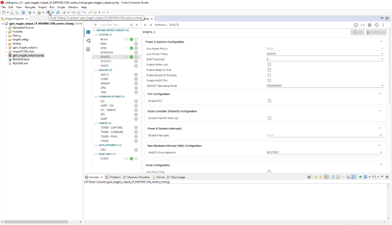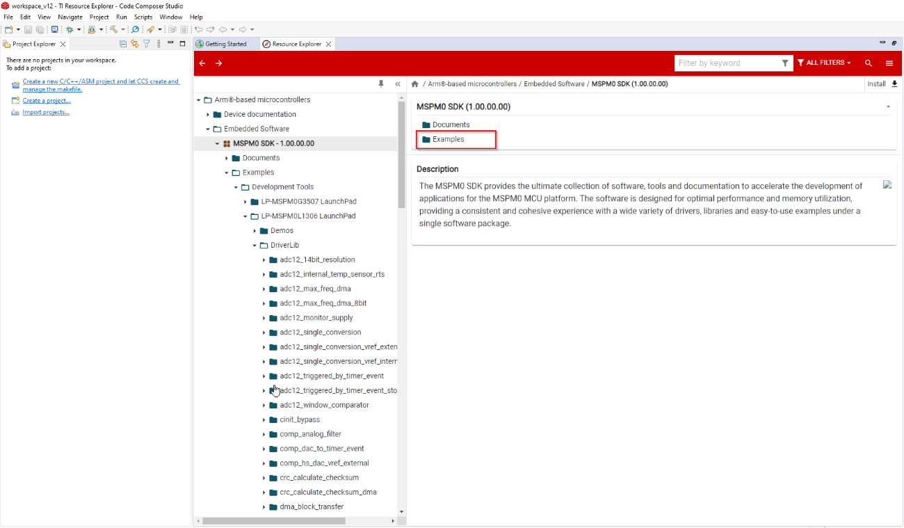 Note: Some examples include support for SysConfig to allow for an easier device configuration.The image below also shows the Sysconfig file that is used to configure the device for the example project.For a complete list of examples supporting SysConfig, check the MSPM0 SDK Examples Guide.For more general information about using SysConfig with MSPM0, please refer to Using SysConfig with MSPM0 available in the SDK’s Tools Guide.