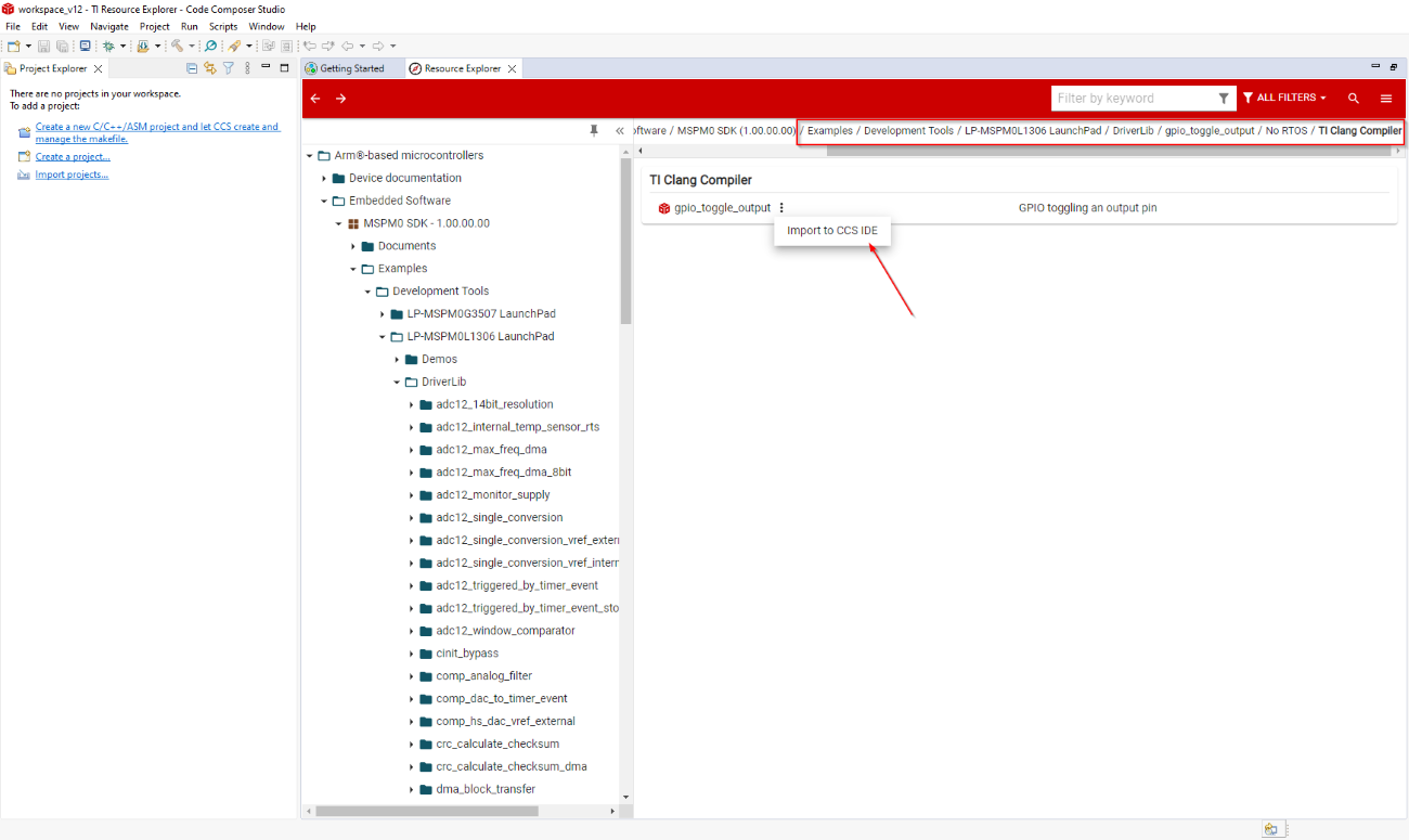 Choose an example, choose the TI Clang compiler folder, and import to CCS IDE by pressing on the 3 dots next to the project file