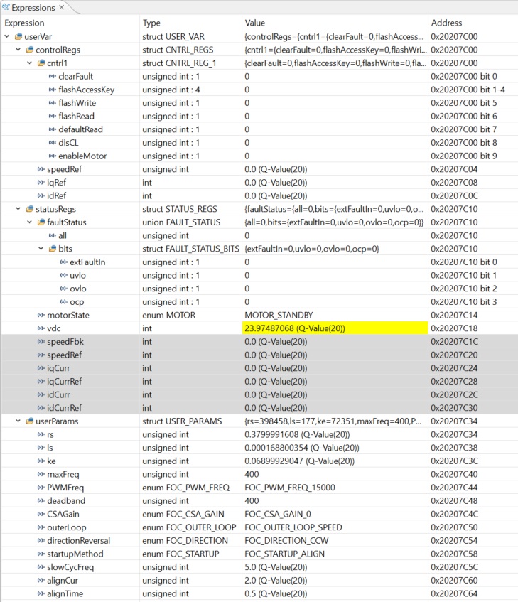Open userVar. Set outerloop to FOC_OUTER_LOOP_SPEED to select outer speed loop. Set speedRef to 100 to spin the motor at 100Hz and set enableMotor to 1 to start the motor. The motor starts spinning.