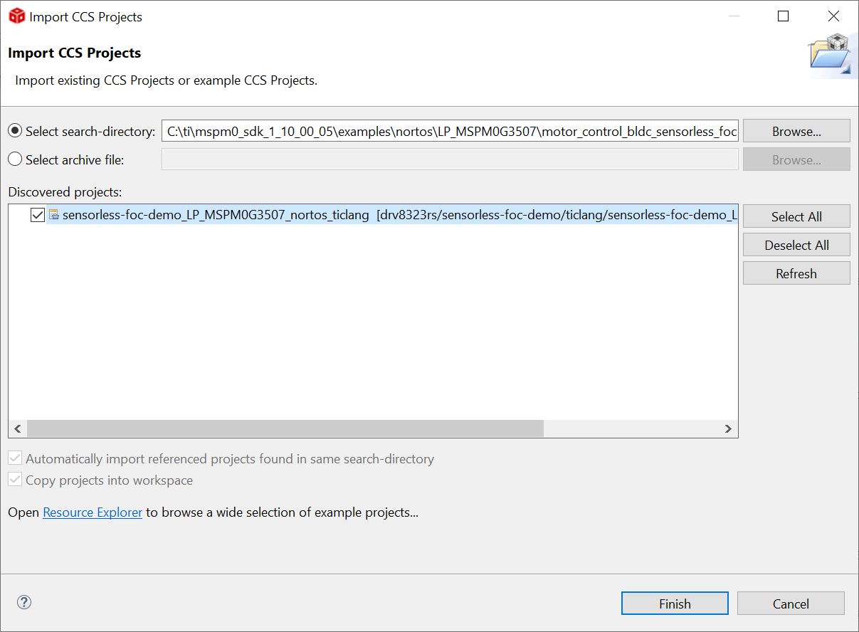 C:\ti\mspm0_sdk_<SDK_Version>\examples\nortos\[LAUNCHPAD]\motor_control_bldc_sensorless_foc.Click Select Folder. Check the desired hardware board, and click Finish to import the project into your workspace.