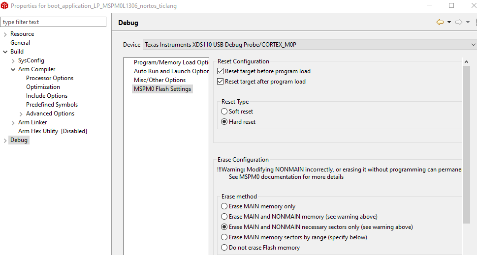 示例。令器件闪烁之前,进入 Properties > Debug 并从“Debug”页面左侧的列表中选择“MSPM0 Flash Settings”。然后配置“Erase method”,仅擦除必要的扇区(如下所示)