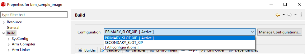此过程还包括编译后步骤,具体可参见 Properties > Build 的 Steps 选项卡。这些编译后步骤负责对映像签名,并将映像输出到二进制文件中,其中包含有关映像的重要信息。输出文件类似于 bim_sample_image_<slot>_<version>_<color>
