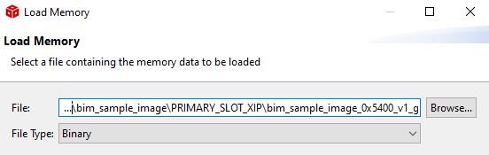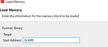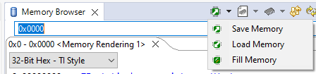 打开器件的存储器浏览器,方法是导航到 View > Memory Browser。要加载二进制映像,请暂停器件运行,点击带箭头的绿色器件封装,然后选择 Load Memory