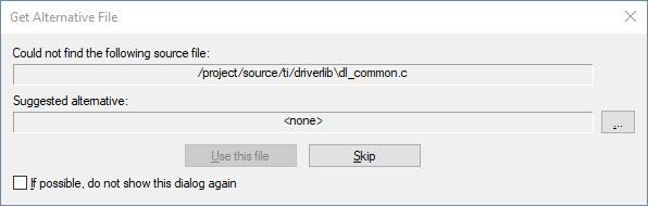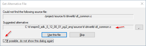 The error can be fixed by selecting the folder with source code. For the example shown, the DriverLib source code is selected: