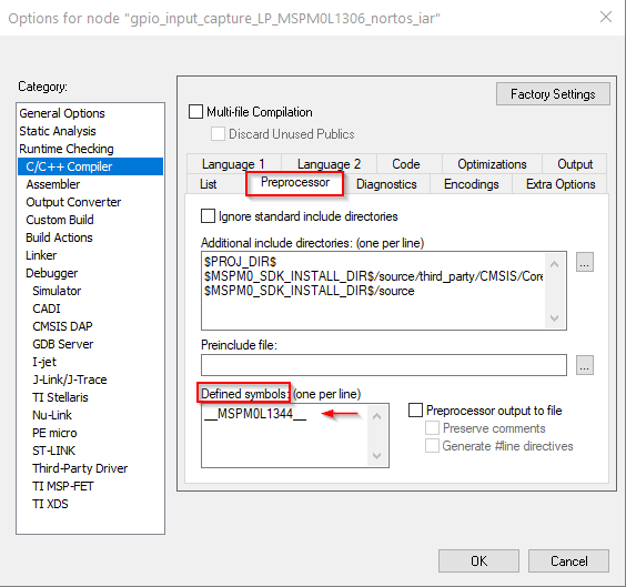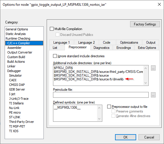 Alternatively, the path for the source code can be added to Options → Runtime Checking → C/C++ Compiler→Preprocessor. For the example shown, the DriverLib source code path was added: