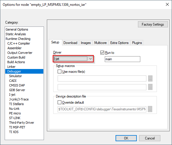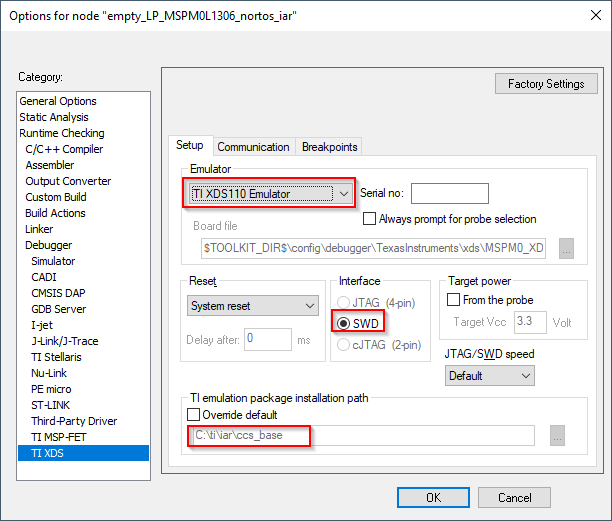 To use the TI-XDS debug probes,select Options → Debugger → Driver → TI XDS: