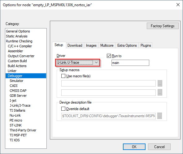 To use the Segger J-Link debug probe, select Options → Debugger → Driver → J-Link/J-Trace: