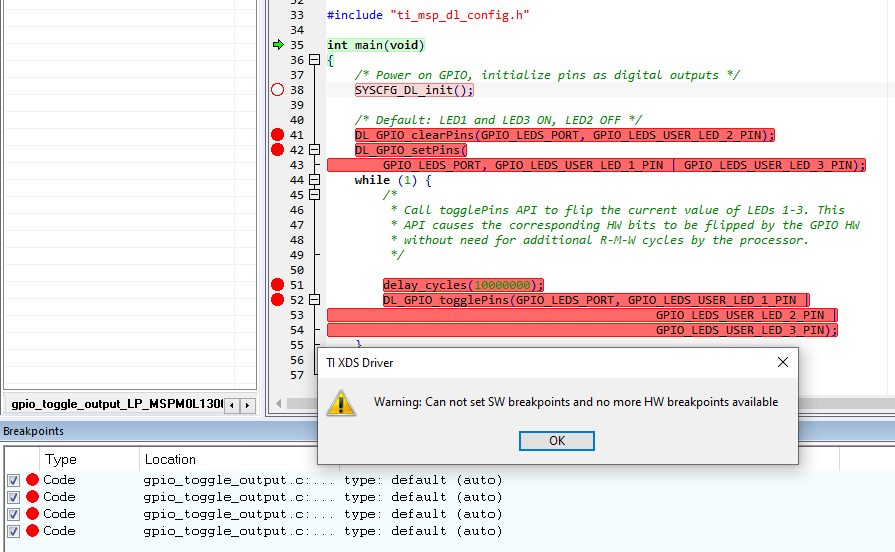 If the max number of breakpoints are set, the following warning will be displayed.