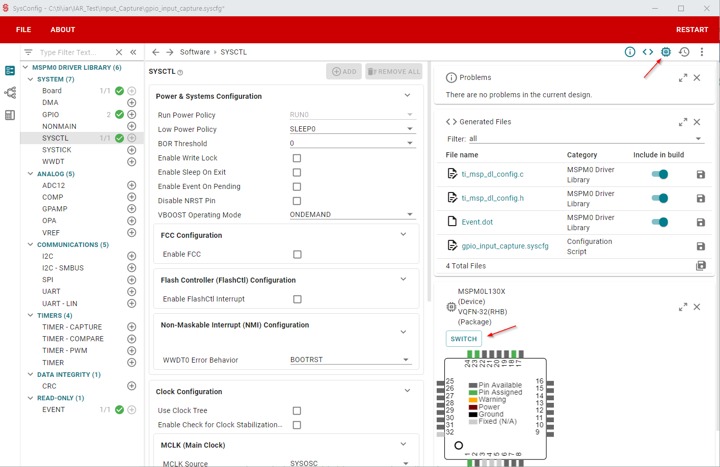 Some examples in the MSPM0 SDK have SysConfig support. SysConfig is an intuitive and comprehensive collection of graphical utilities for configuring pins, peripherals, radios, subsystems, and other components. SysConfig helps you manage, expose, and resolve conflicts visually so that you have more time to create differentiated applications.