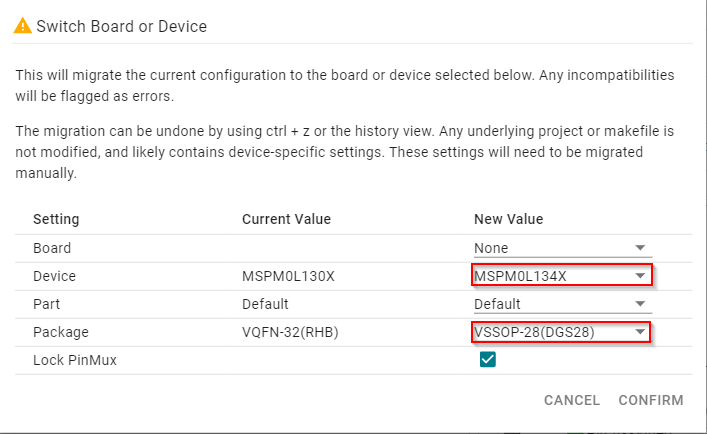Select the corresponding options for the new MSPM0 device and click CONFIRM.