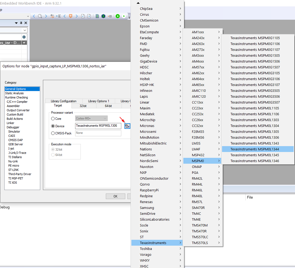 In the project options, select General Options → Target → Device. Select the MSPM0 device.