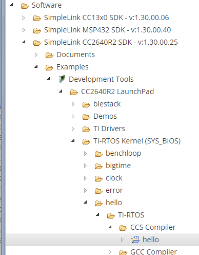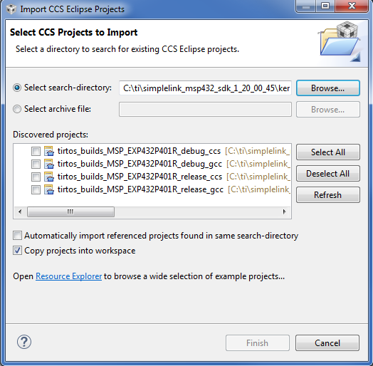 Alternatively, this project can be imported into CCS by selection Project → Import CCS Projects... and navigating to the kernel/tirtos/builds directory. Then select the desired board and compiler project.