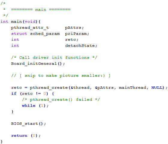 In main() , after BIOS_start() is called, it never returns, but instead gives control to the TI-RTOS scheduler which will call the Task functions of the constructed tasks (e.g. workTaskFunc). Normally, task functions will enter an infinite loop and never return, letting TI-RTOS switch to higher priority tasks, Swi or Hwi.