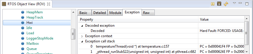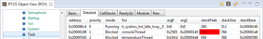 As discussed above, Runtime Object View (we'll call it ROV2 here for short) can be used to get a snapshot of the whole RTOS. By default the information is only updated via JTAG when the target is halted. First we are going to halt the code as we are toggling the led.