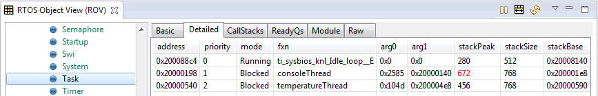 We can see that the workTaskFunc is currently running and we can also see that the stack usage for the task has peaked at 112 of 1024 bytes (STACKSIZE) bytes so far, so no risk of stack overflow. Note: depending on your device, compiler, and versions, the values will probably be different. We generally recommend you start with a larger stack size and then trim it down once everything is working properly.