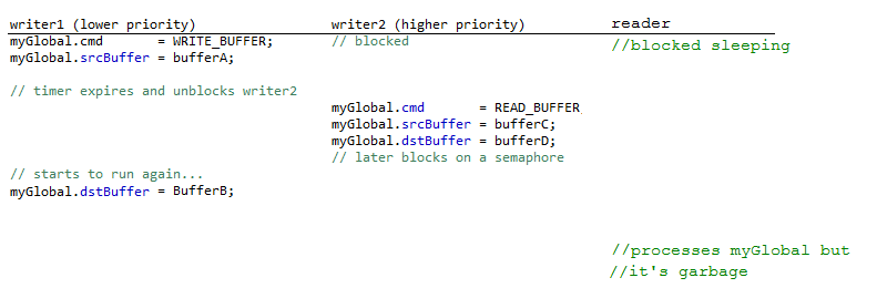 writer1(priority 1) andwriter2(priority 2) tasks both modify this structure andreaderreads and acts on this struct. Let's saywriter1is running andwriter2is blocked. Here is a situation where without the semaphore protection, corruption can occur.