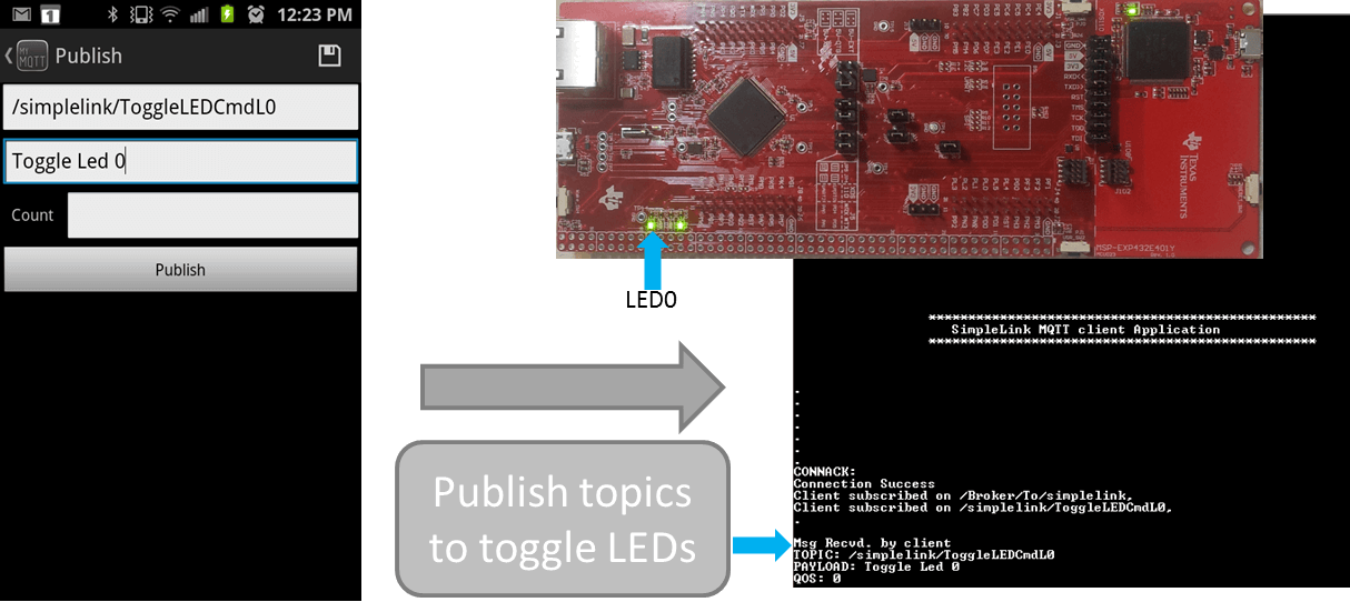 Send a message from the MQTT client app to the SimpleLink device by publishing the