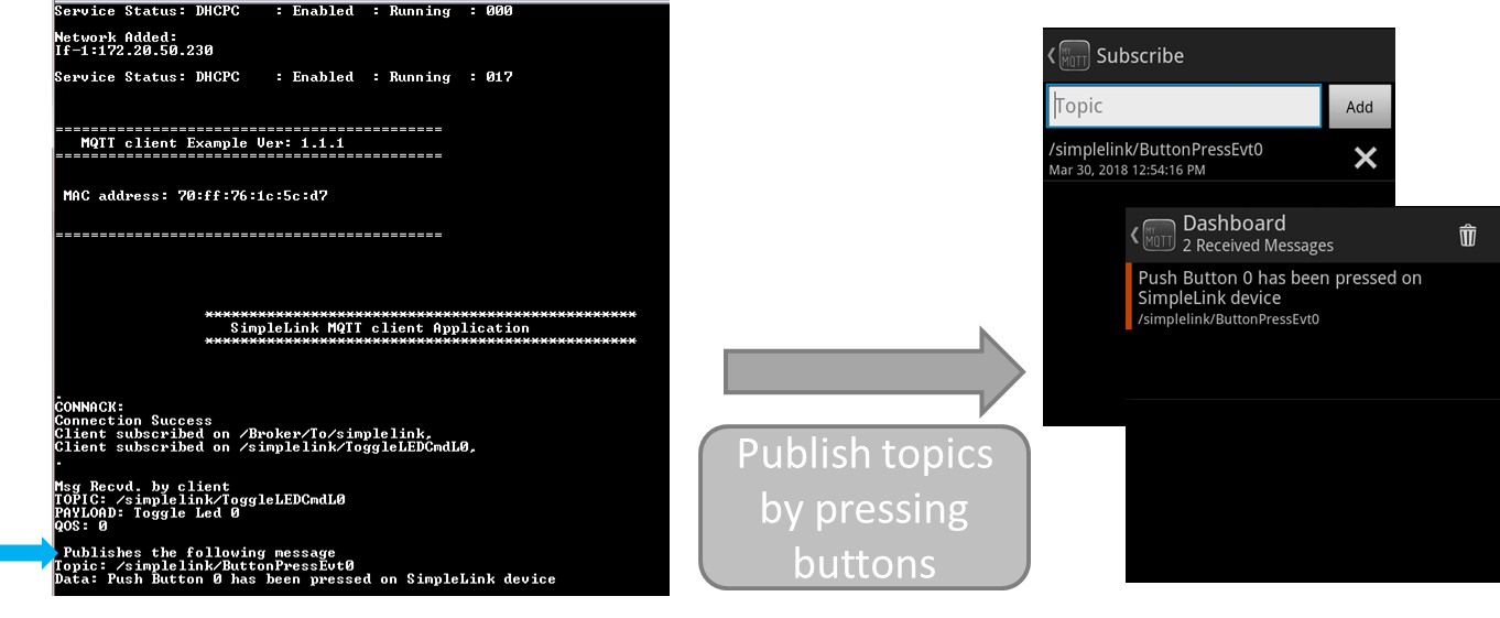 topic to send a text message that will be printed on the console.Using the MQTT client app, subscribe to the topic published by the SimpleLink client (