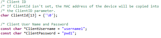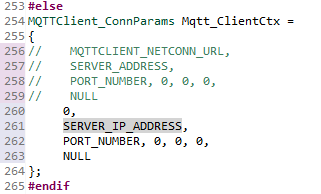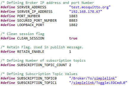 in the Variables section. Set the flags and address to the local broker address (shown below). We need the Local Clients to be linked to the Local Server by IP address instead of the example's default URL.MQTTClient_ConnParams Mqtt_ClientCtx = { // MQTTCLIENT_NETCONN_URL, // SERVER_ADDRESS, // PORT_NUMBER, 0, 0, 0, // NULL 0, SERVER_IP_ADDRESS, PORT_NUMBER, 0, 0, 0, NULL };