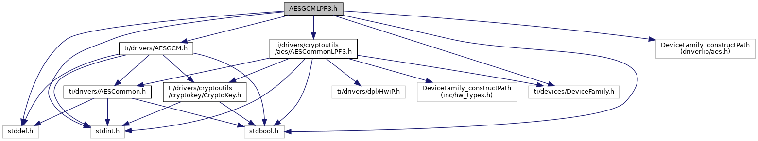 #include <stdbool.h>#include <stddef.h>#include <stdint.h>#include <ti/drivers/AESGCM.h>#include <ti/drivers/cryptoutils/aes/AESCommonLPF3.h>#include <ti/devices/DeviceFamily.h>#include <DeviceFamily_constructPath(driverlib/aes.h)>