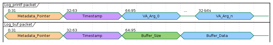All log packets begin with a 32-bit metadata pointer followed by a 32-bit timestamp. The next fields depend on the type of log statement: